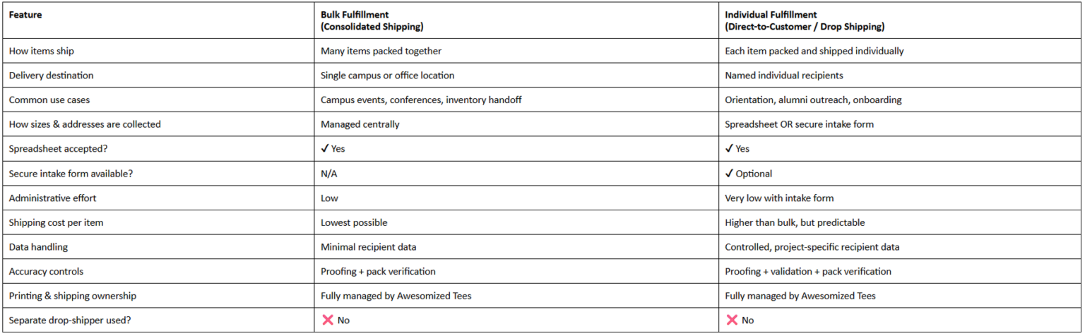 Bulk fulfillment means all items are produced together and shipped in one or more boxes to a single destination.